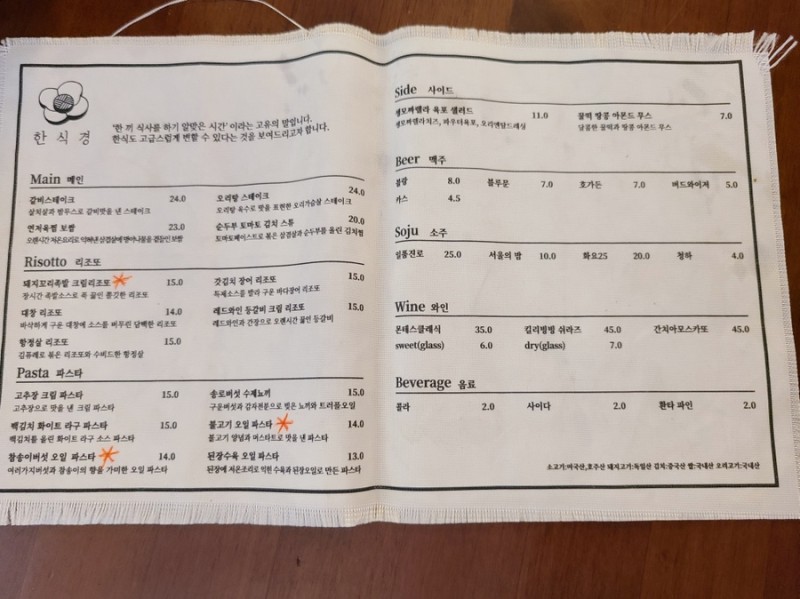 한식과 양식을 합친 그런 메뉴들이라서 특이한 음식이 많더라구요. 고민하다가 별표되어 있는 음식 중에 골랐어요 :)