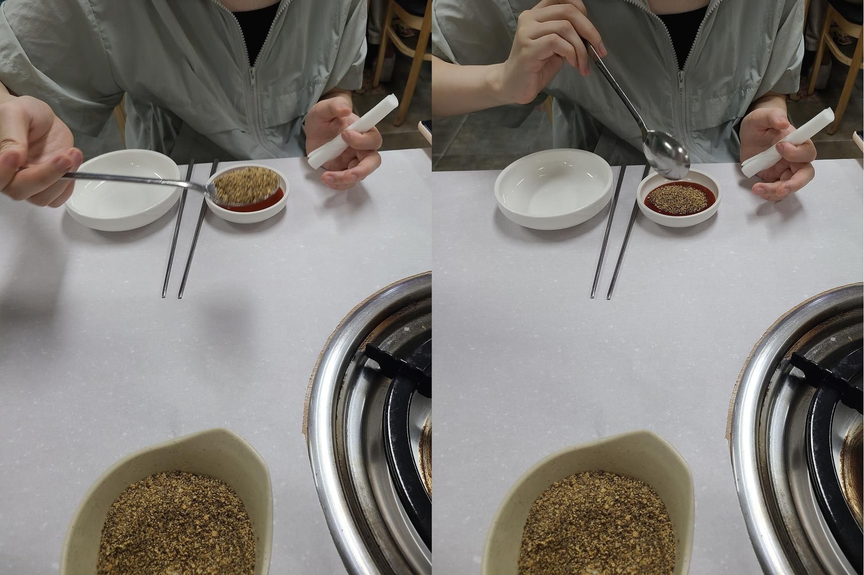 들어가면 우리들이 바로 해야할 것은 바로 메뉴판도 보지 않고 직원분께 반마리로 주세요!를 외칩니다. 그리고 아래 사진의 숙달된 조교처럼 숟가락에 들깨가루를 가득 담아 초장에 넣어 퐉퐉 섞어 주는 것입니다. 많이 넣을수록 맛있습니다!