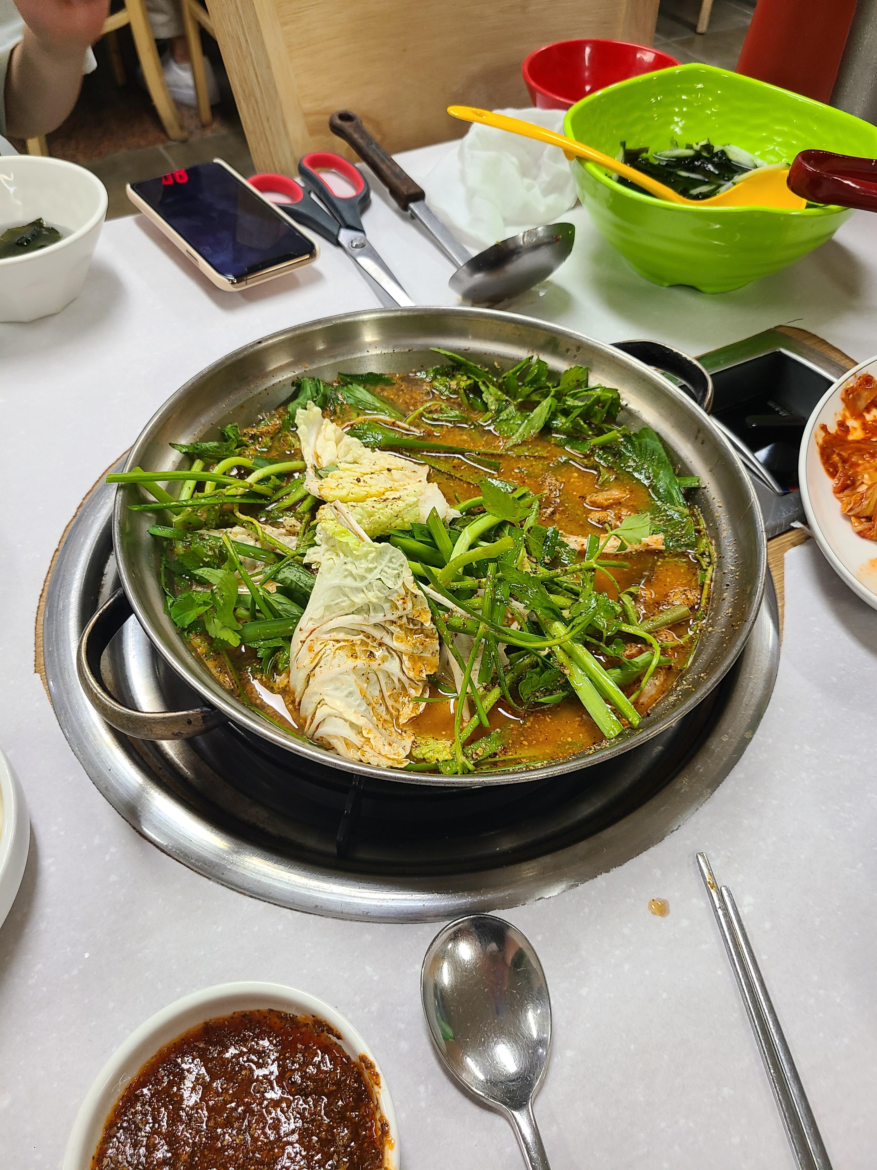상대방과 초장을 섞으면서 노가리를 까다보면, 기다리던 청둥오리전골과 반찬들이 금방 나옵니다. 사진에는 생지( 새김치 )가 안나왔지만, 직원분이 오셔서 직접 손으로 찢어주는 생지를 주십니다. 이건 나중에 밥을 위해 저희들은 아껴 먹습니다.