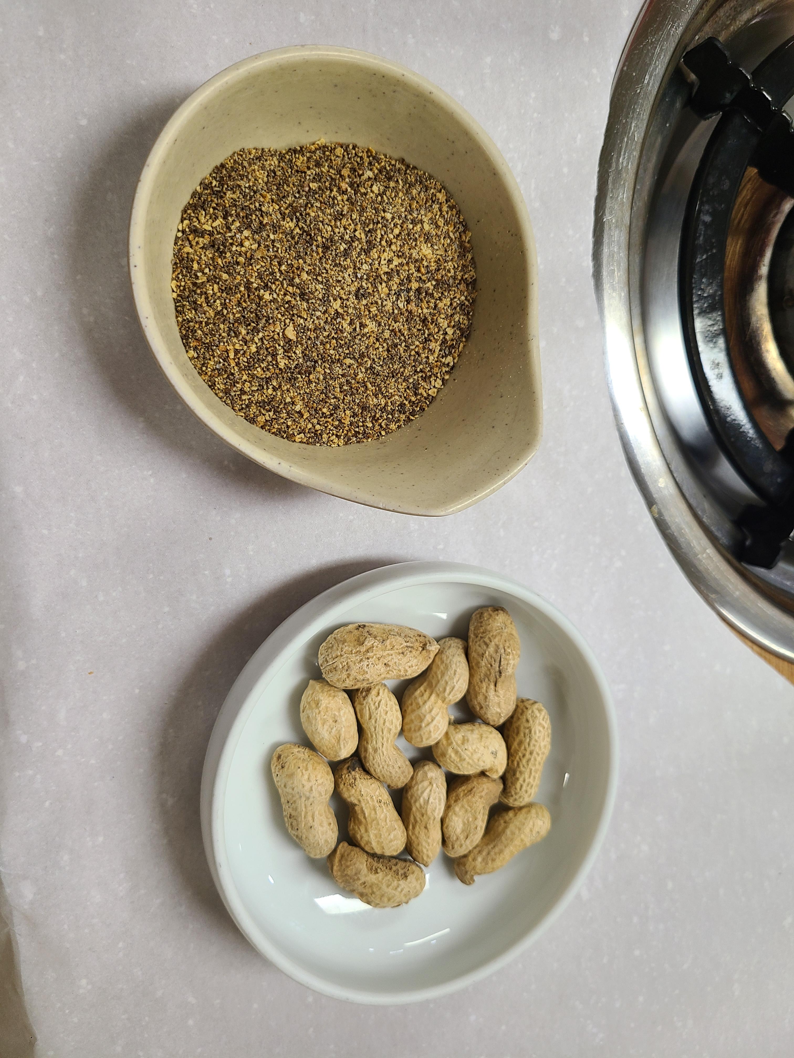 직원분이 안내해주는 테이블에 착석하면, 땅콩과 들깨가루가 기본으로 있습니다.