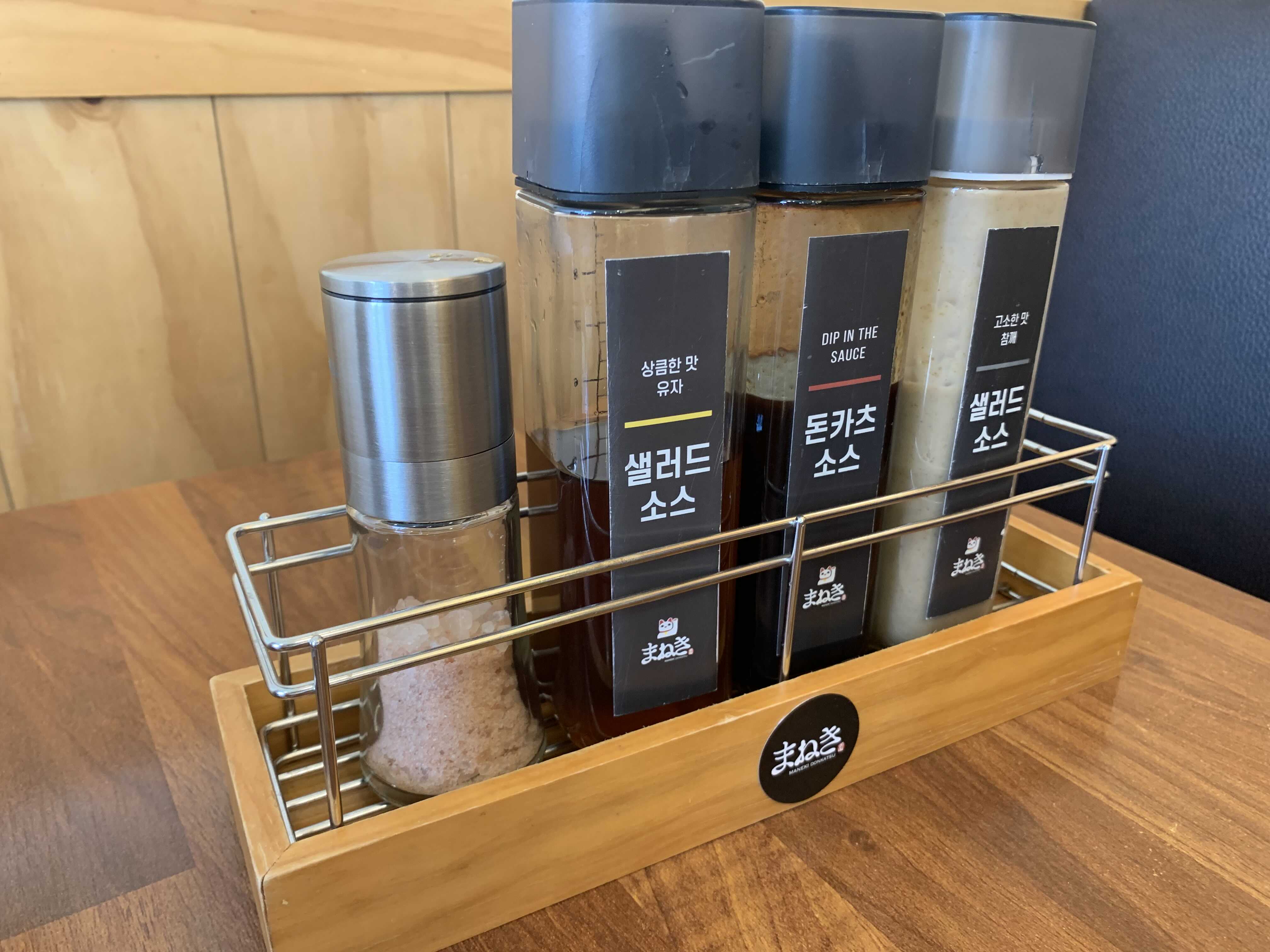 테이블에는 본인 기호에 맞는 샐러드 소스가 두종류있고 돈카츠 소스가 있어요